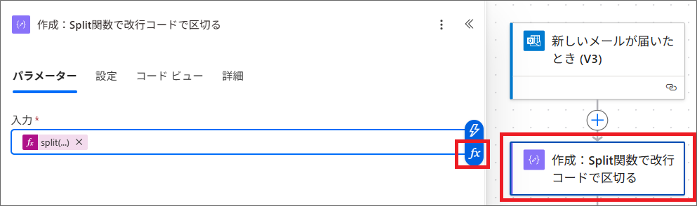 2.「データ操作」>「作成」アクションを追加し、関数式「fx」で、以下のようなsplit関数式を設定します。