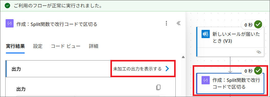 「作成」アクションの「未加工の出力を表示する」を選択し、関数式で取得されたデータをみてみます。