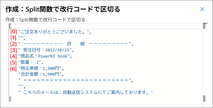 すると、以下のようにメール文のデータが、改行コードで区切られて、配列データとなっています。