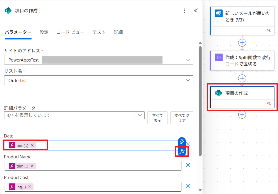 4.「SharePoint」>「項目の作成」アクションを追加し、対象のSharePointサイト、リストを選択した後、詳細パラメータで、各列に登録する値を関数(fx)で設定します。