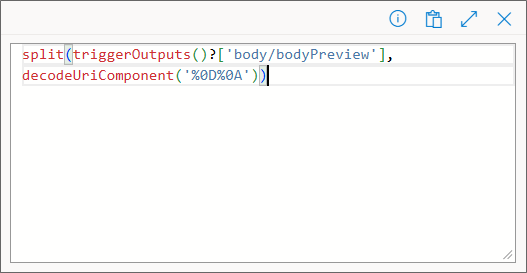 split(triggerOutputs()?['body/bodyPreview'], decodeUriComponent('%0D%0A'))