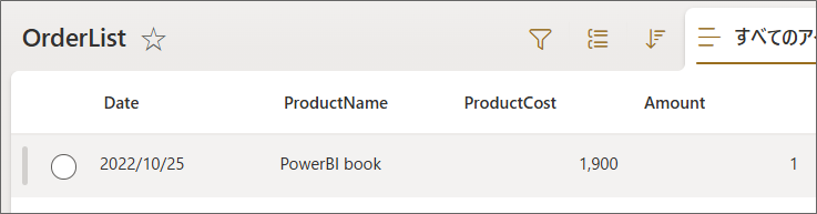例えば、受注日付、商品名、数量、税込単価等のデータをそれぞれ抽出し、以下のようにSharePointリストに格納することができます。