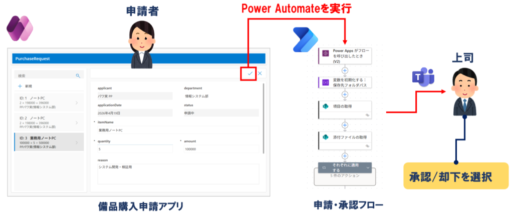 このシリーズでは、Power Automateと、Power Appsを組み合わせた、以下のような「備品購入申請システム」を構築していきます。