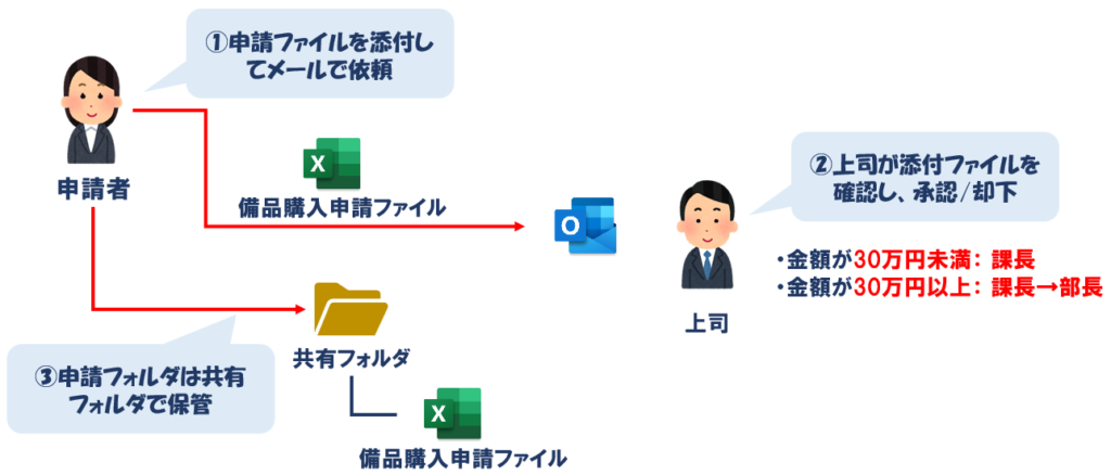 1. 申請者が備品購入申請のファイルを添付して、メールで上司に依頼する。