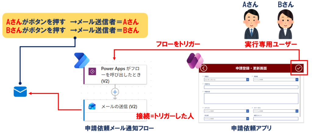 実行専用ユーザーは、フローをトリガーした人のアカウントでアクションを実行する仕組みです。