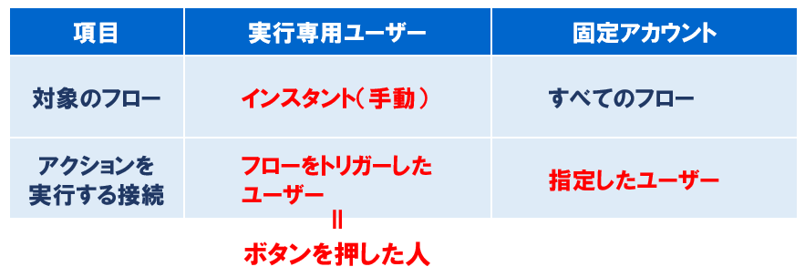 全てのフローは、「実行専用ユーザー」か「固定アカウント」の、どちらかでトリガーやアクションが実行されます。