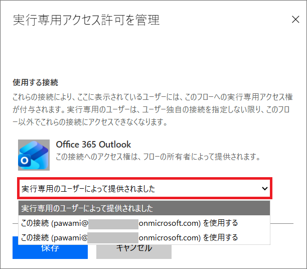 次に、Outlook コネクタを「実行専用ユーザー」に設定した場合から見ていきます。
