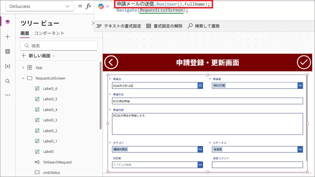 Power Appsの申請アプリで、申請登録ボタンをクリックすると、Power Automateのフローが実行され、Outlook を使って管理者にメールが送信されます。