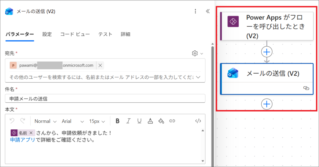 この設定の場合、フローをトリガーした人の接続で、メールが送信されるという動きになります。