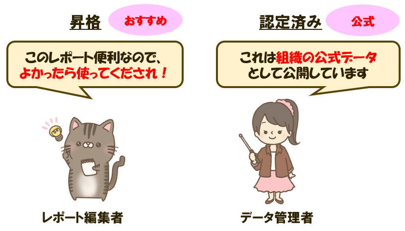 昇格と認定済みの違いは、昇格は「おすすめ」データという位置づけで、「このレポート便利だから、みんな使ってね」というイメージです。