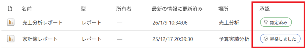 「昇格」や「認定済み」を設定することで、重要なレポートやセマンティックモデルを目立たせ、組織内で広めることができます。