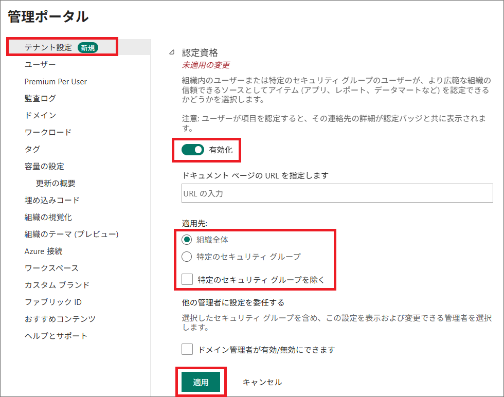 適用先で、特定のセキュリティグループ等を設定することで、設定された Power BI管理者 が、コンテンツを『認定済み』として承認できるようになります。