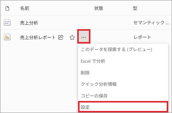 3.セマンティックモデルの設定もレポートと同様、「…(三点リーダー)」から、「設定」をクリックします。