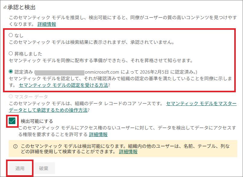 このとき、「検出可能にする」にチェックを入れると、このセマンティックモデルにアクセス権がないユーザーもこのデータを見つけ、アクセス権を要求することができるようになります。
