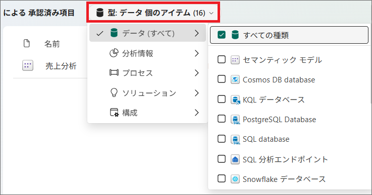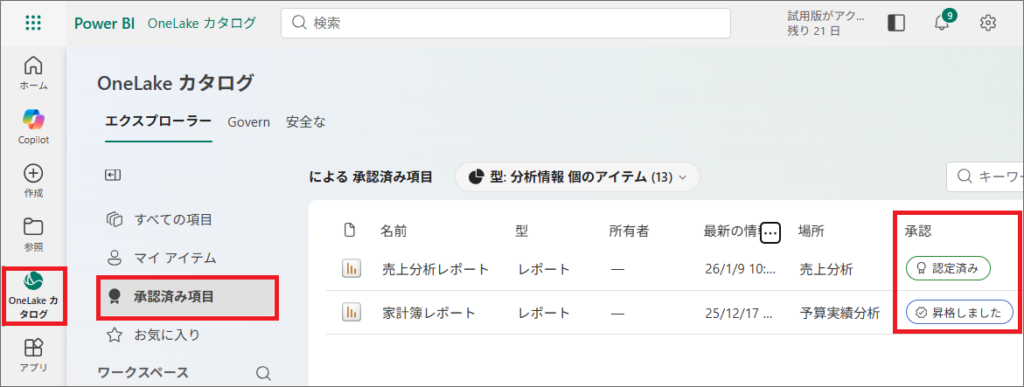 1.「OneLakeカタログ」を開き、「承認済み項目」をみると、「昇格」や「認定済み」を設定したコンテンツが、一覧の中でも分かりやすく表示されるようになります。